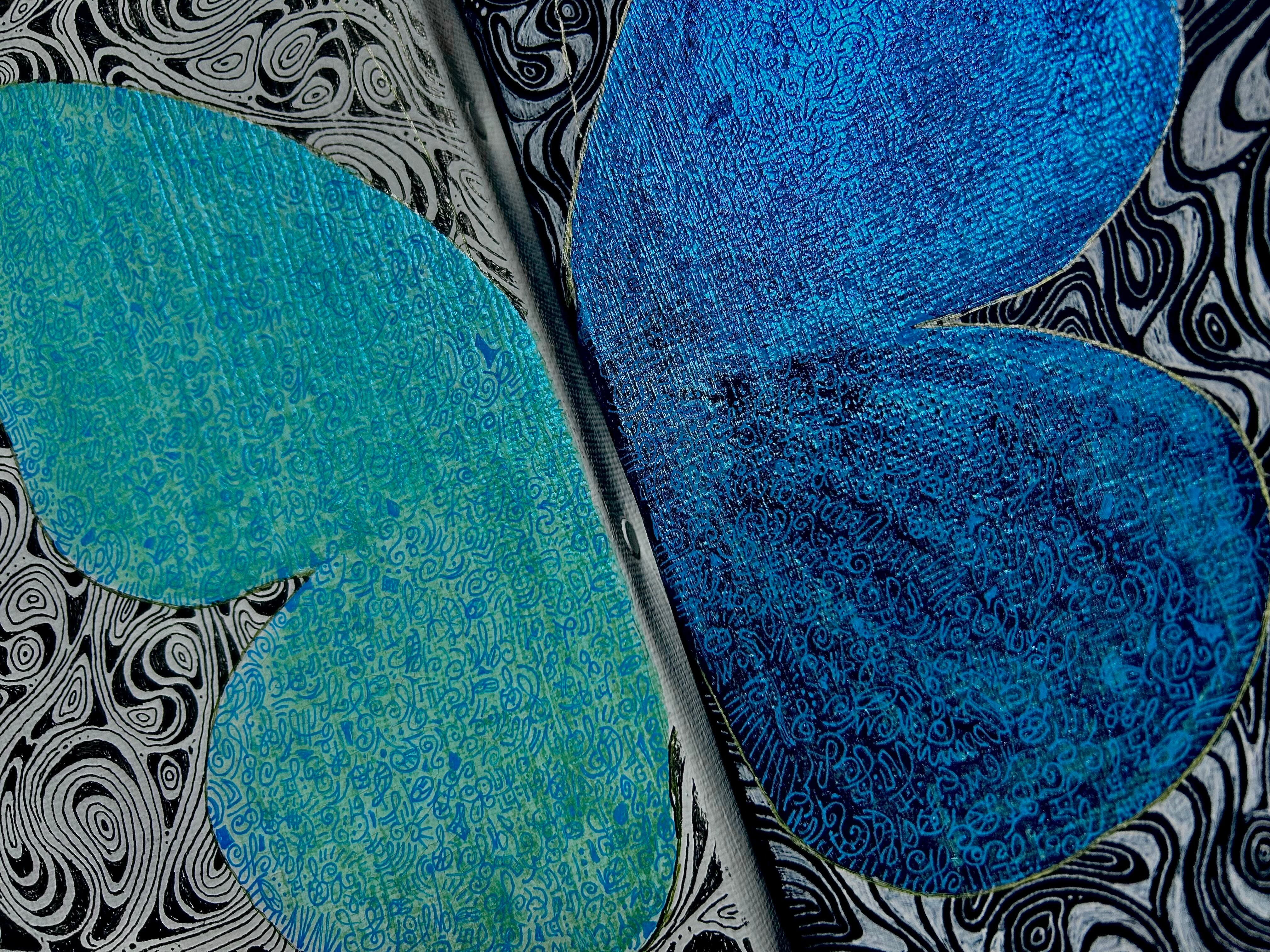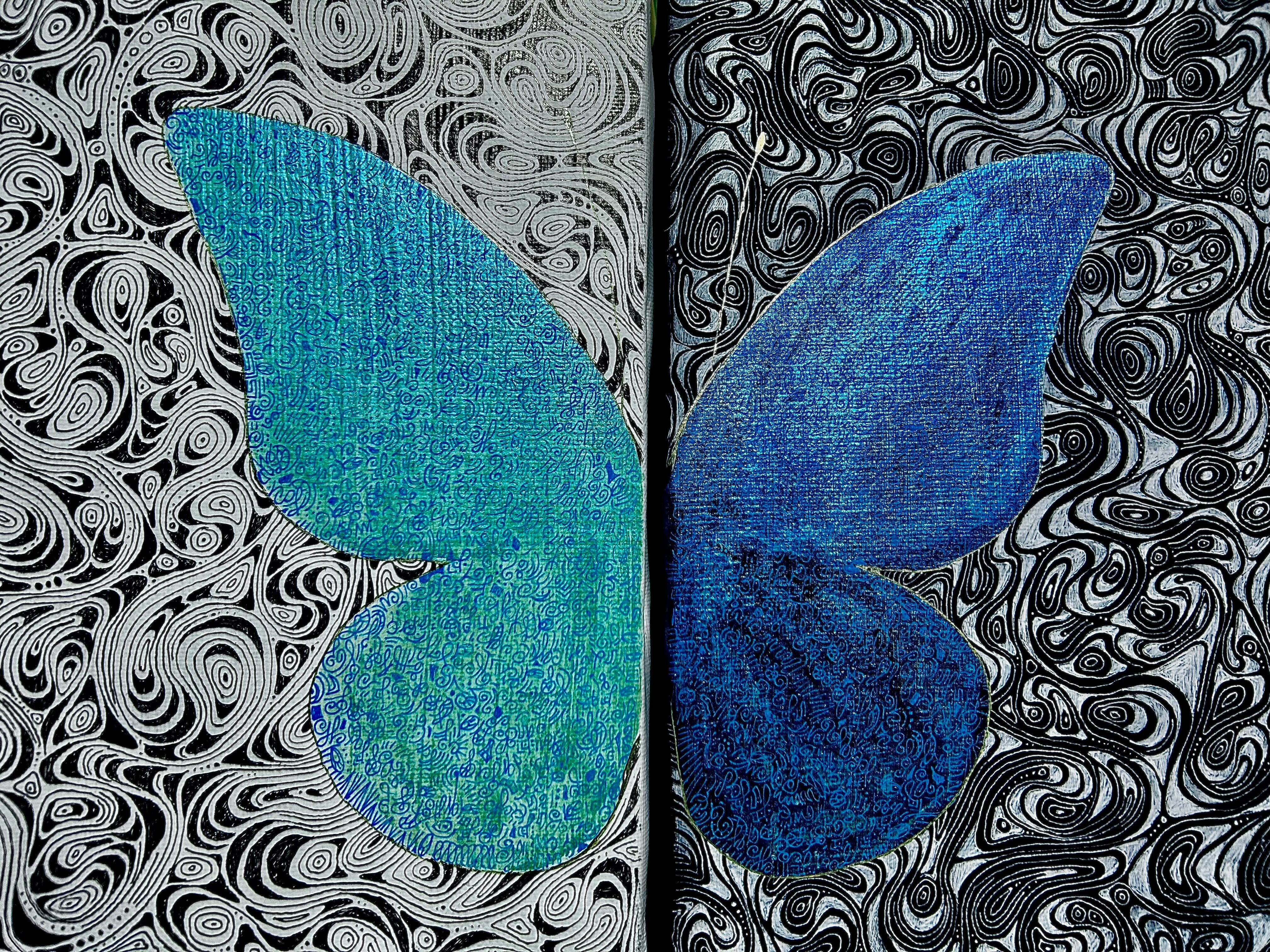 そんな過去の自分と重ねて青い蝶を、自分の思考回路、白黒思考に乗せてこの作品を描きました。